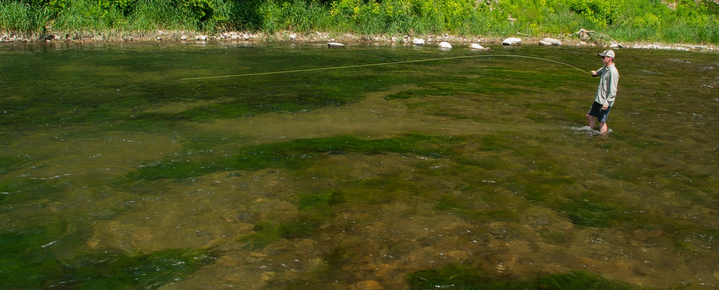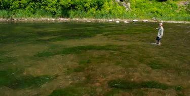 Wade fishing here offers a very different experience compared to the upper river, with deep limestone troughs that hold both rainbow and brown trout. In the spring, this section often sees consistent caddis and Sulphur activity, while streamer fishing can be especially productive as larger fish patrol the deeper runs.