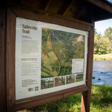 This map leads to the lower end of the Tailwater Trail and provides excellent wade-fishing access into productive water near sections that border private property. Be sure to stay within the riverbanks while wading downstream to avoid trespassing. This area can be especially rewarding during the summer Sulphur hatches and is a favorite among anglers who enjoy covering water on foot. When the river is generating, high water typically takes about 45 minutes to reach this access point.