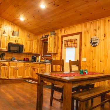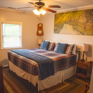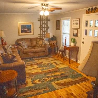 The cabin features two bedrooms, one full bath, a fully equipped kitchen, and inviting indoor and outdoor spaces with scenic river and mountain views. A classic front porch provides the perfect place to unwind after a day on the water, while direct yard access makes it easy to enjoy the river throughout your stay.